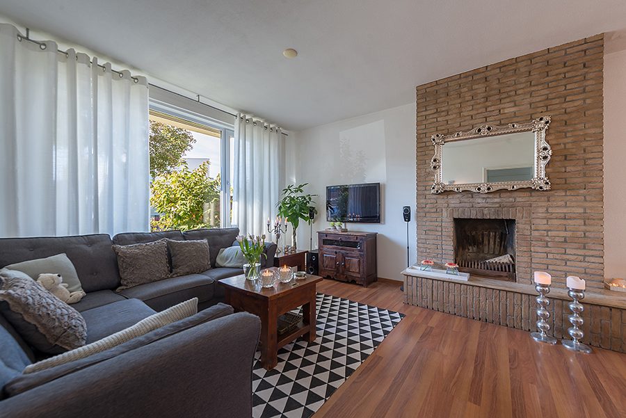 Doorzonwoonkamer ca. 8.20 x 3.90/3.30 met laminaatvloer en open haardpartij.
