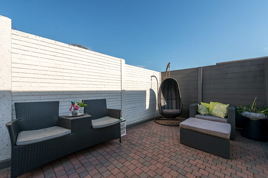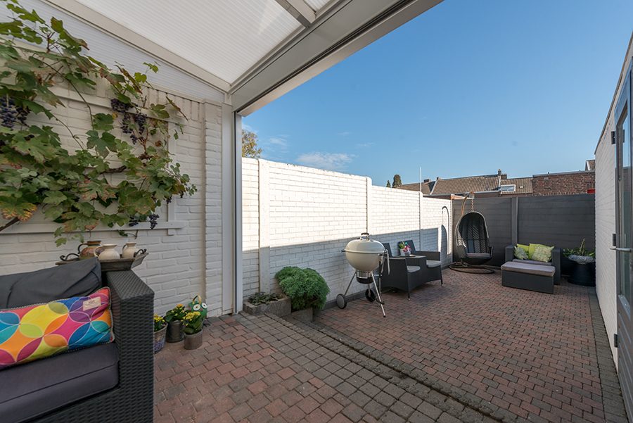 Geheel omsloten en onderhoudsvrije siertuin met acheruitgang.