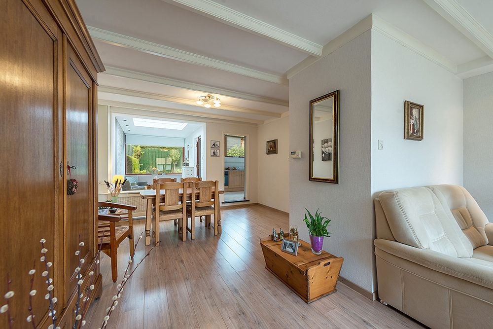 Ruime woonkamer ca. 8.00 x 5.00/4.20 met laminaatvloer en muurkast onder de trap.