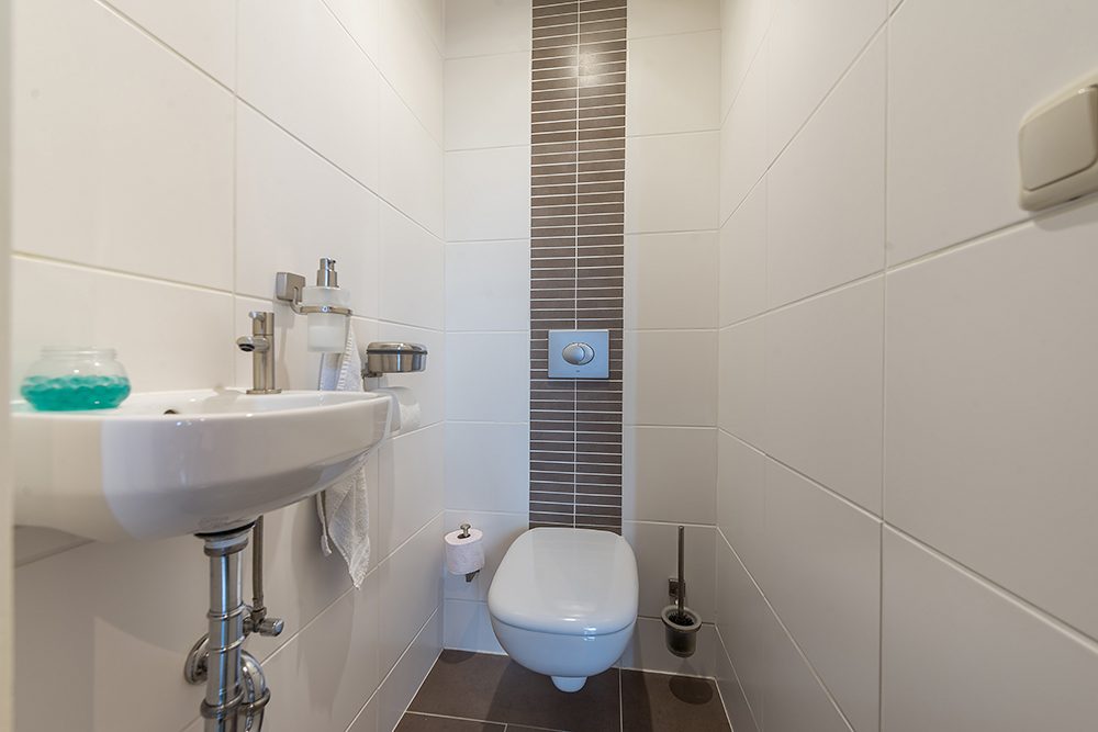 Entree/hal met marmeren vloer, vernieuwde meterkast, garderobekast en modern gastentoilet met hangtoilet en fonteintje.