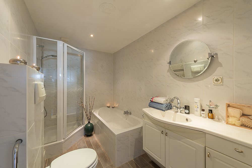 Moderne en geheel betegelde badkamer met ligbad, douche, wastafelmeubel en hangtoilet.