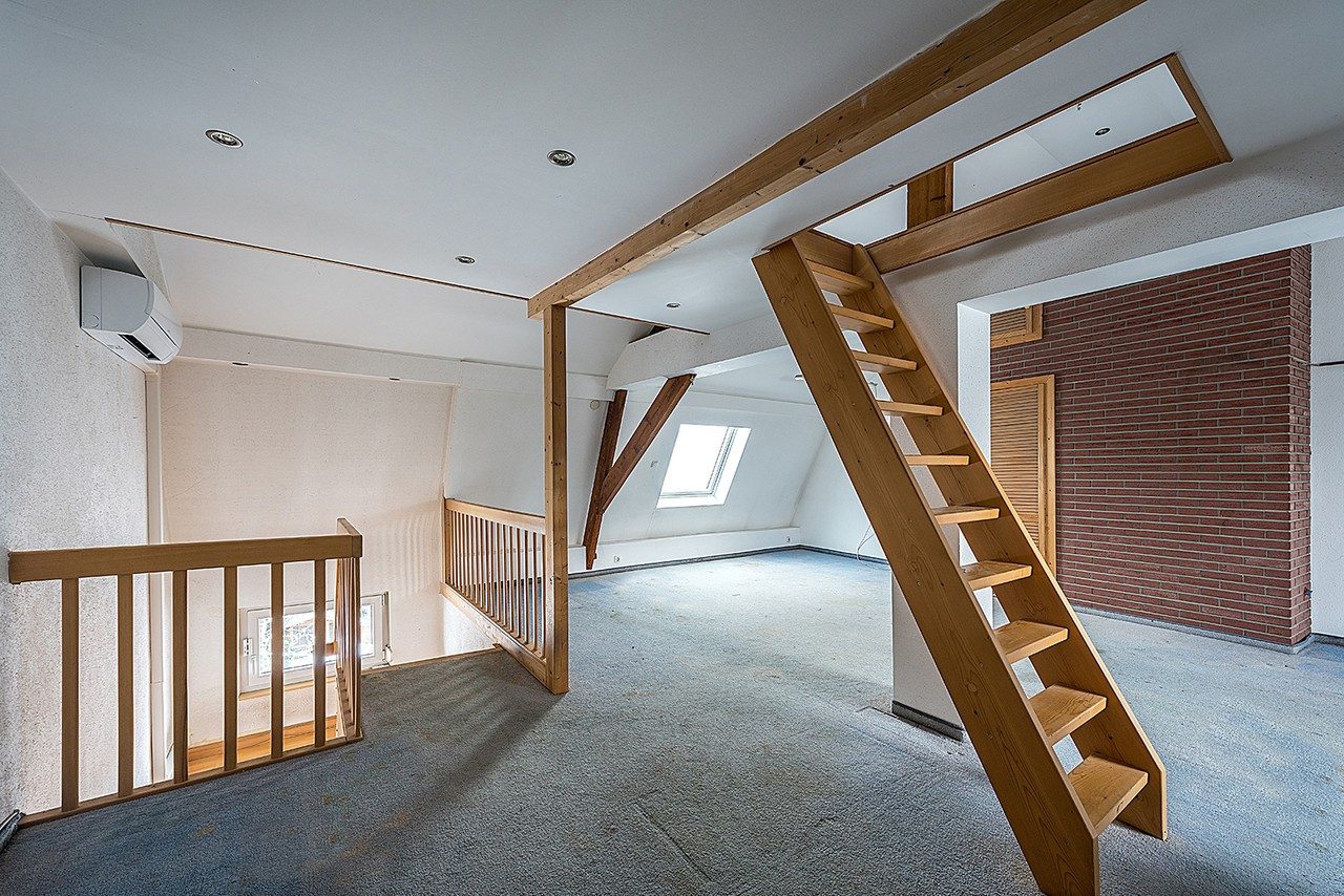 Vaste trap naar een grote zolderkamer ca. 6.00 x 4.00 met groot dakraam, airco en eigen badkamer met douche, wastafel en toilet.