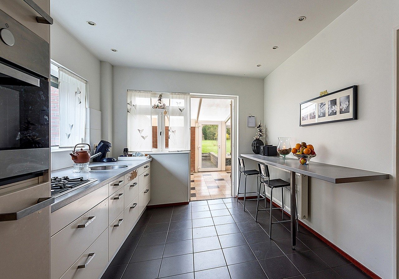 Gesloten keuken ca. 3.68 x 2.85 met tegelvloer, aanbouwkeuken v.v. gascomfort, afzuigkap en koelkast.
