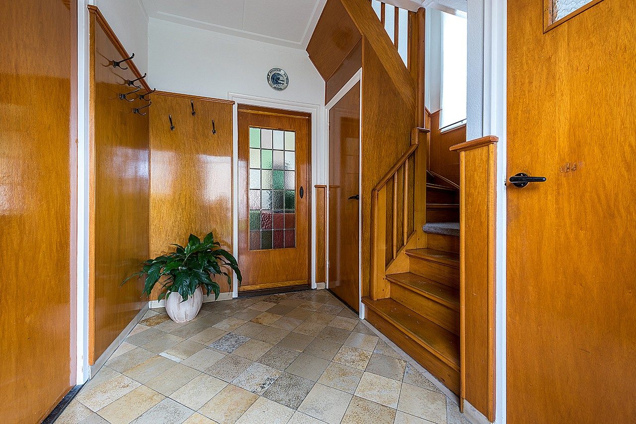 Entree/hal met tegelvloer, meterkast, gastentoilet en trap naar de verdieping.