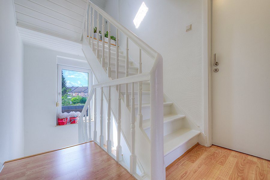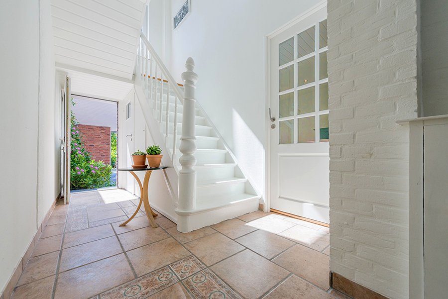 Entree/hal met tegelvloer, vernieuwde meterkast, gastentoilet en bordestrap naar de verdieping. Vanuit de hal deur naar de achtertuin.