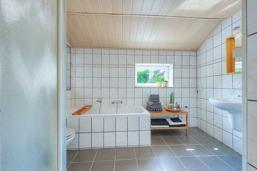 Badkamer ca. 3.00 x 2.00 met ligbad, douche, wastafel en hangtoilet.