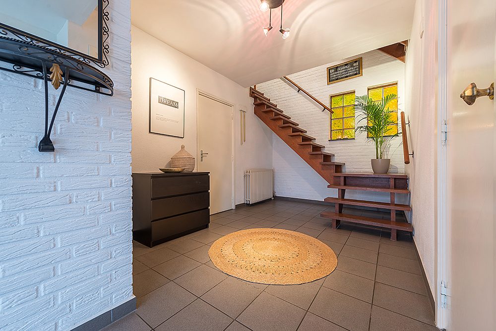 Entree/hal met modern gastentoilet met fonteintje, meterkast, garderobe en trap naar de verdieping.
