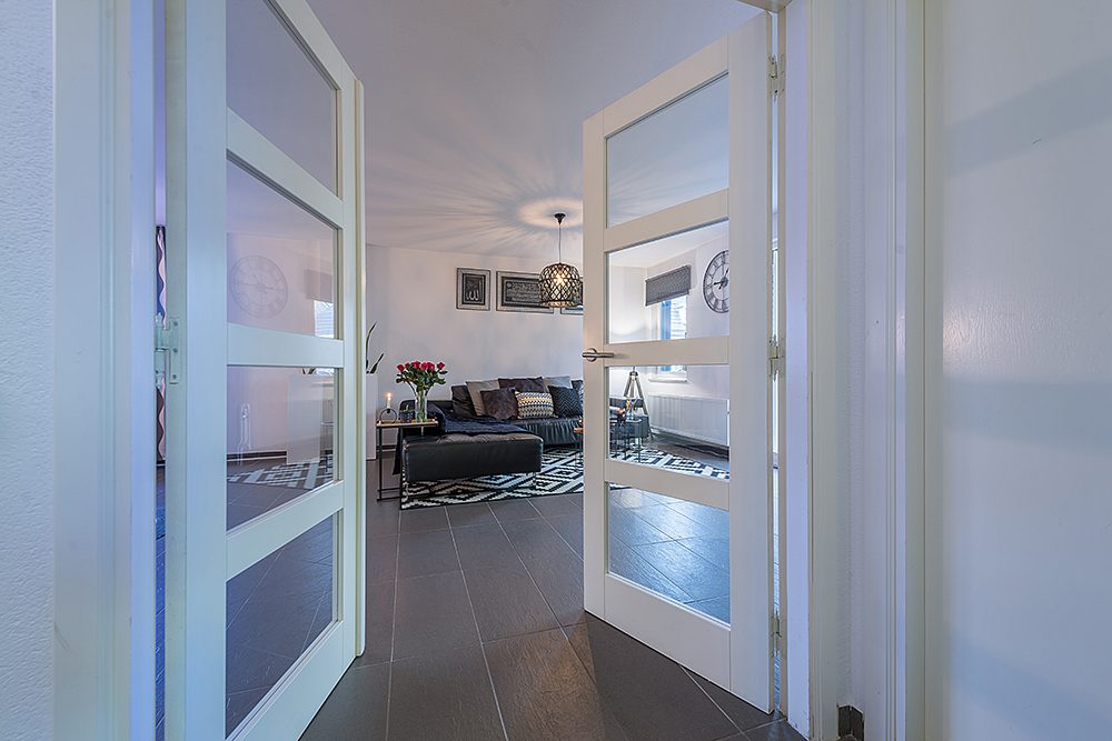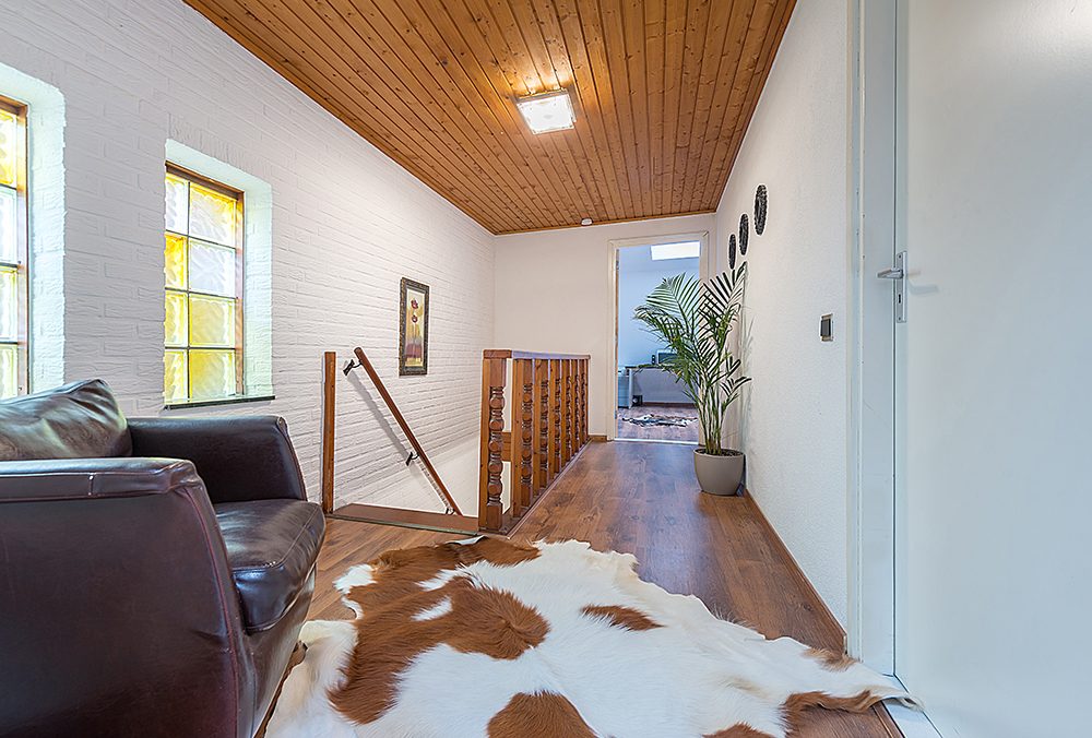 Ruime overloop met laminaatvloer.