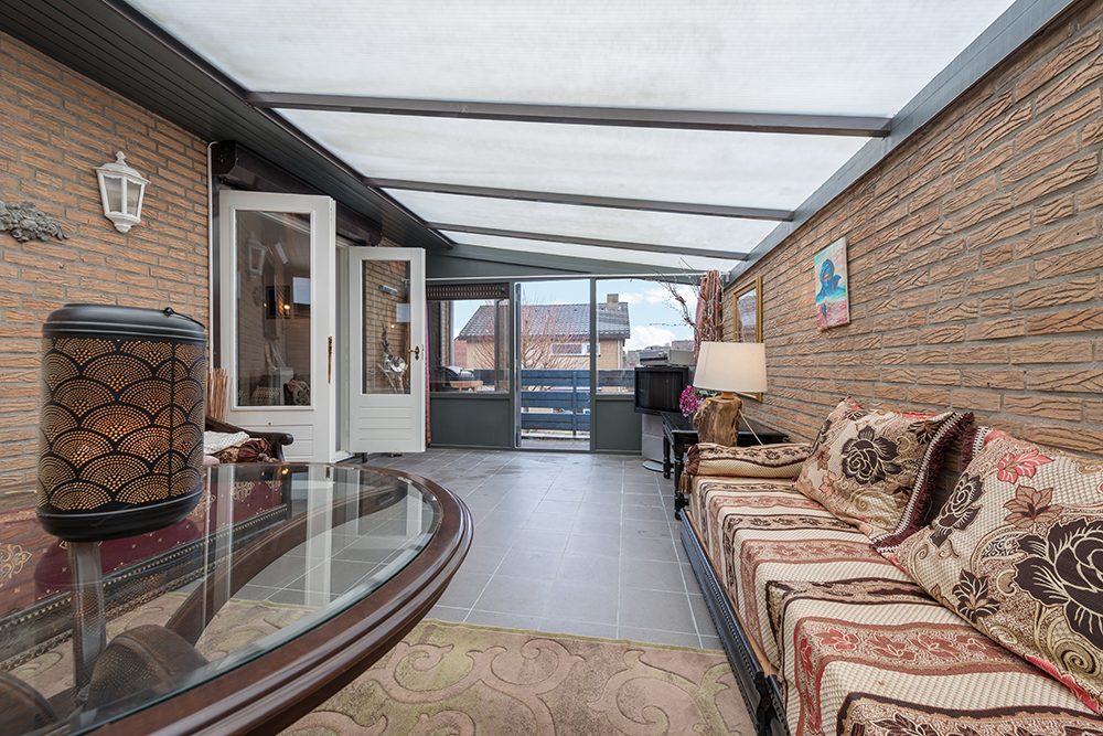 Vanuit de keuken toegang tot een groot overdekt dakterras ca. 6.00 x 3.70 met tegelvloer en toegang tot het balkon.