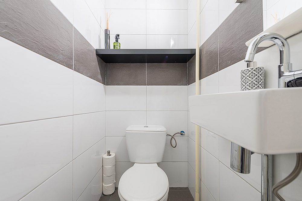 Grote overloop met tegelvloer, modern gastentoilet met fonteintje.