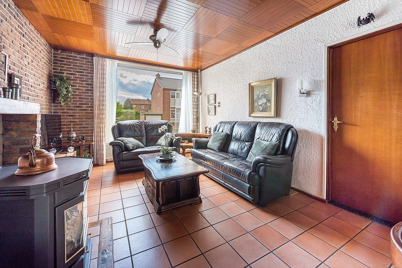 Woonkamer c. 6.90 x 3.50 met tegelvloer en gashaard.