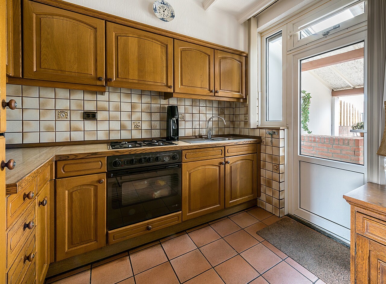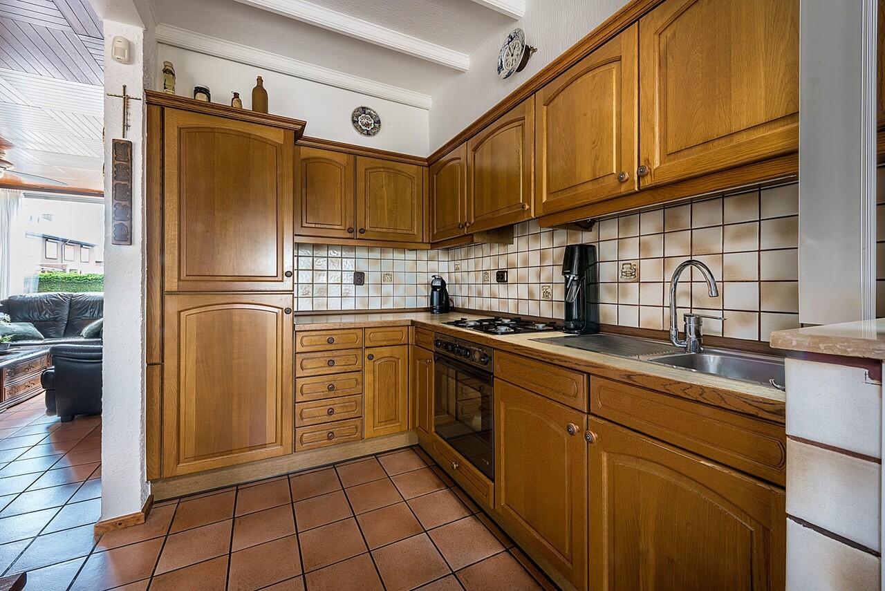 Open verbinding naar de keuken ca. 2.60 x 2.00 met hoekkeuken v.v. gascomfort, afzuigkap, koelkast en diepvries.