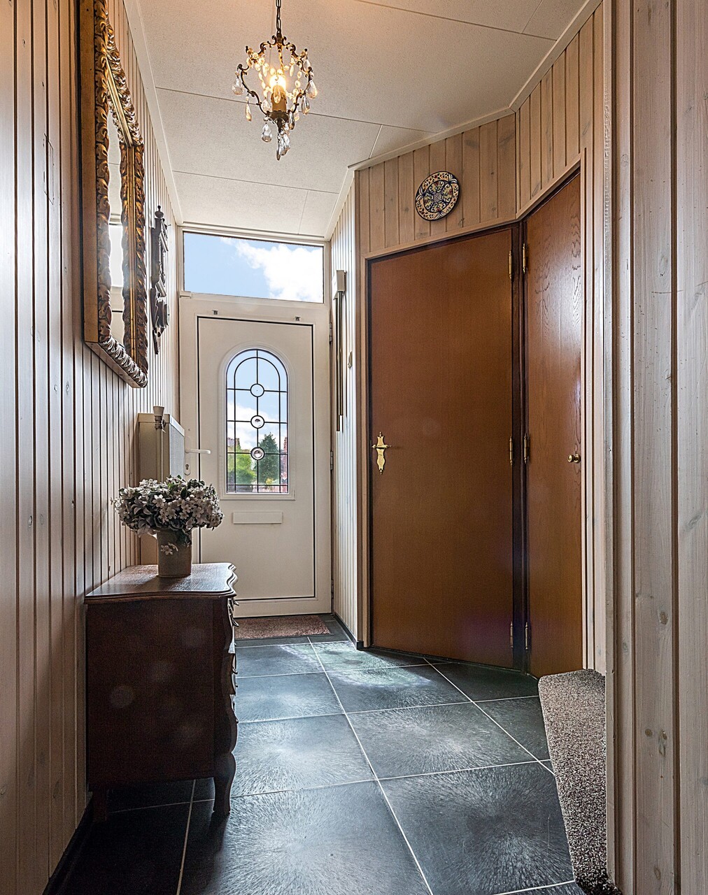 Entree/hal met tegelvloer, vernieuwde meterkast en gastentoilet met fonteintje.