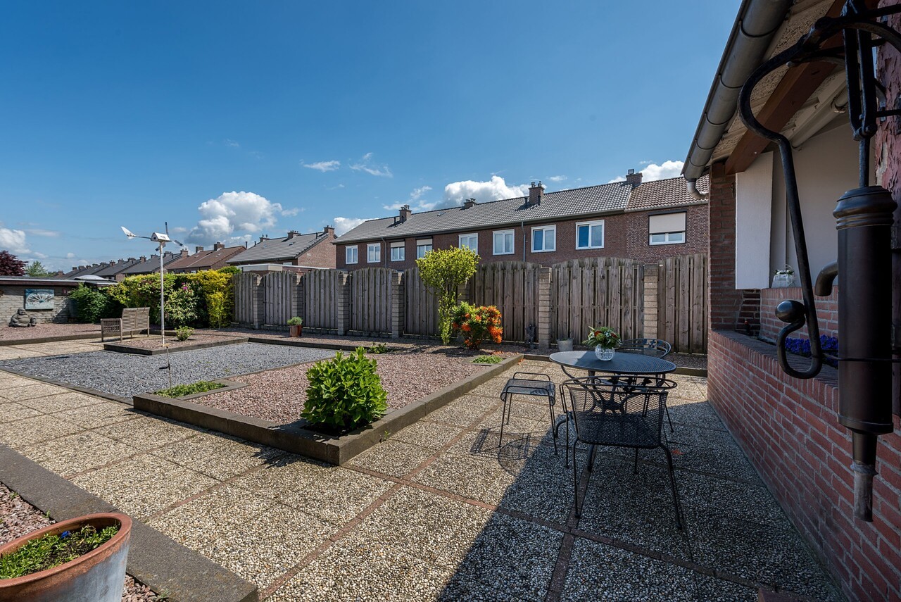 Grote onderhoudsvrij aangelegde siertuin met toegang tot een garage met elektrische sectionaal garagepoort en separate zij-uitgang naar een brandgang.