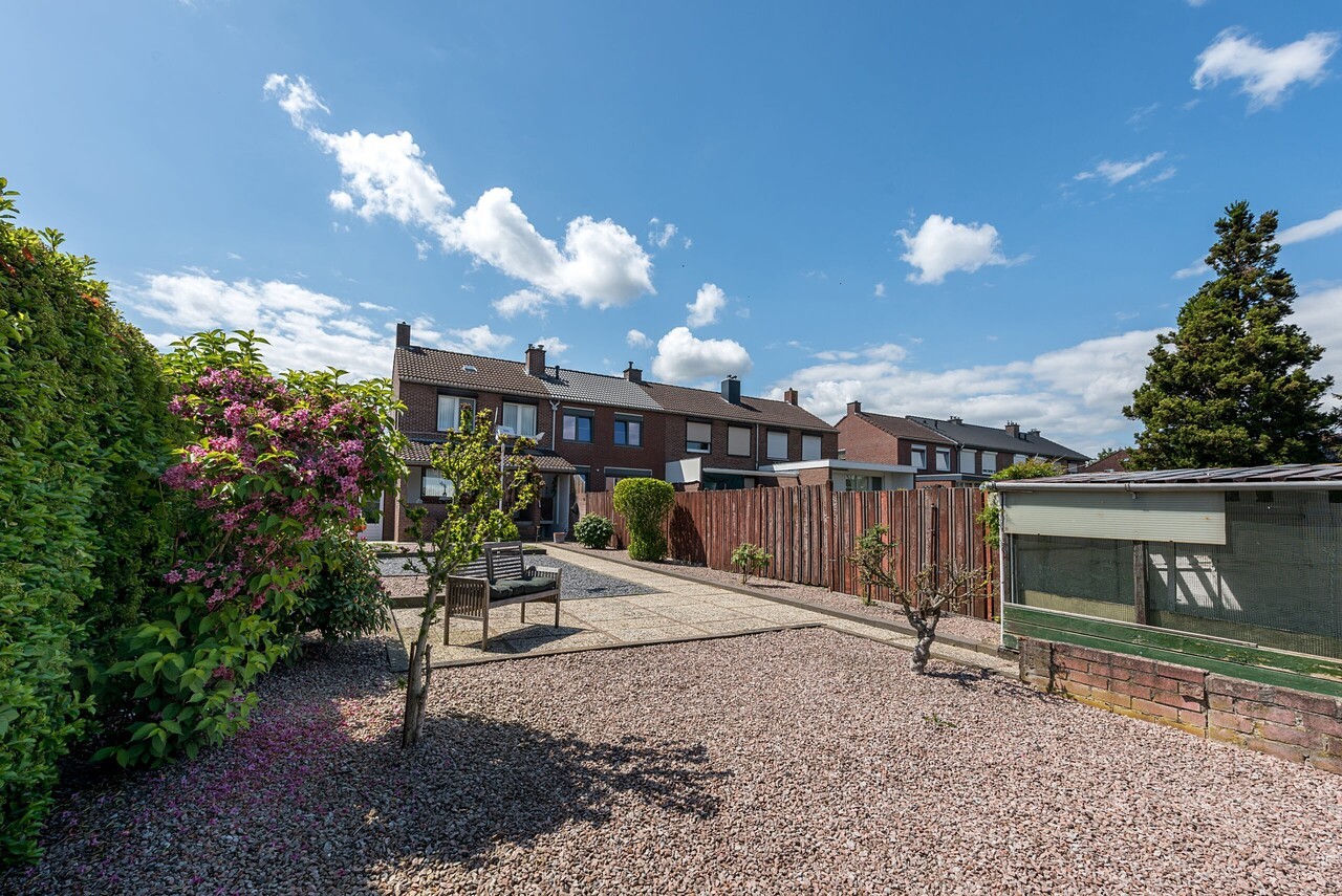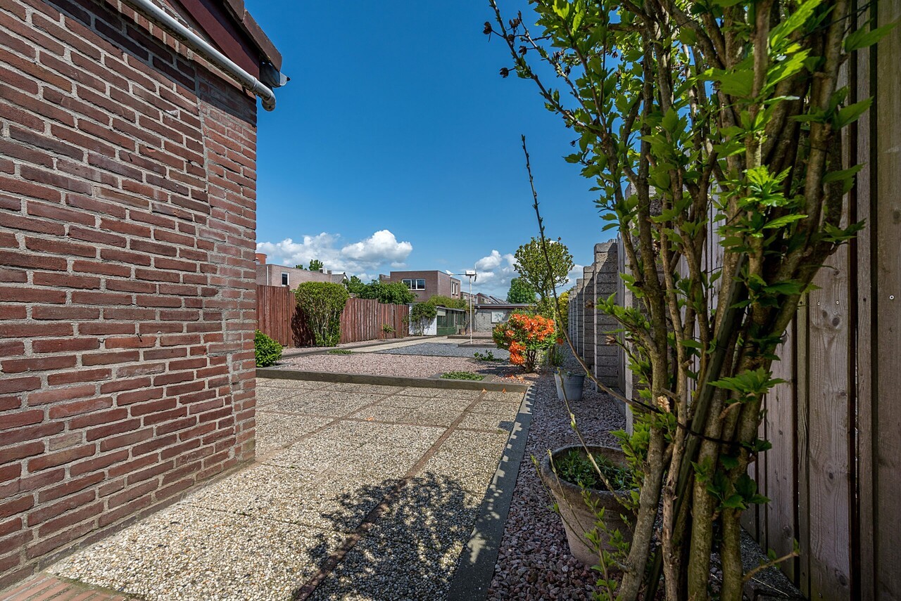 Hoekwoning met garage en grote onderhoudsvrije siertuin met buitenberging.
