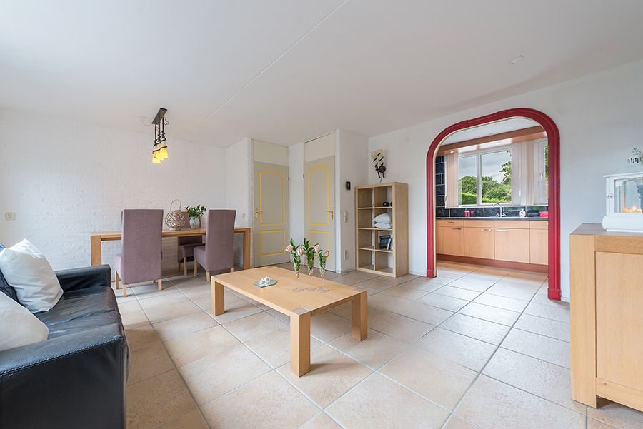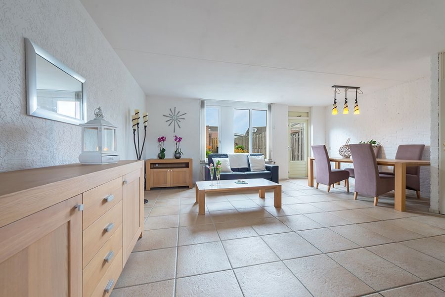 Woonkamer ca. 5.80×5.00 met tegelvloer, muurkast onder de trap en deur naar de achtertuin.