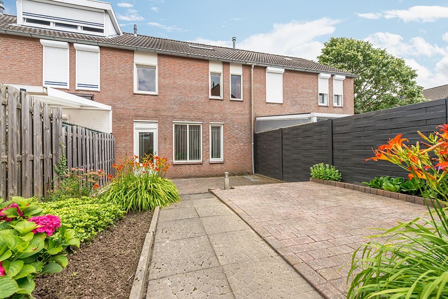 Fraaie omsloten siertuin met optimale bezonning en buitenberging. De tuin is aan de achterzijde middels pad bereikbaar.