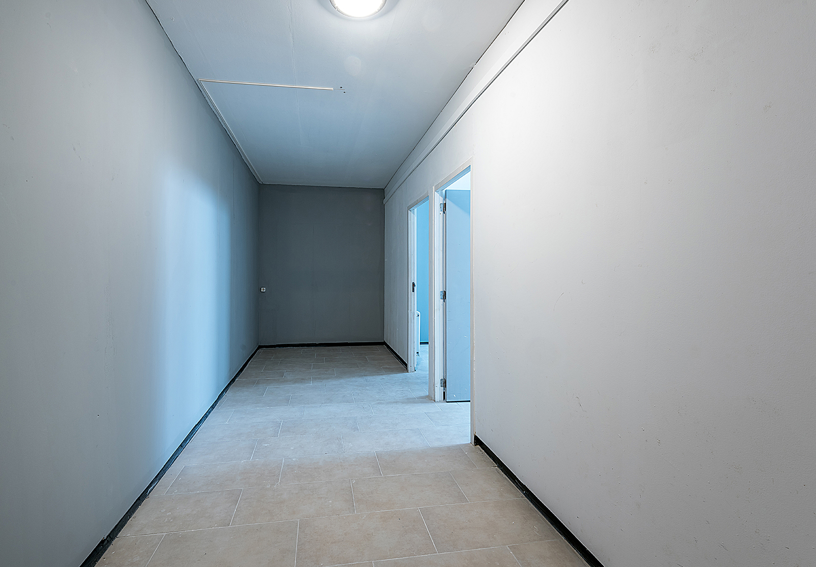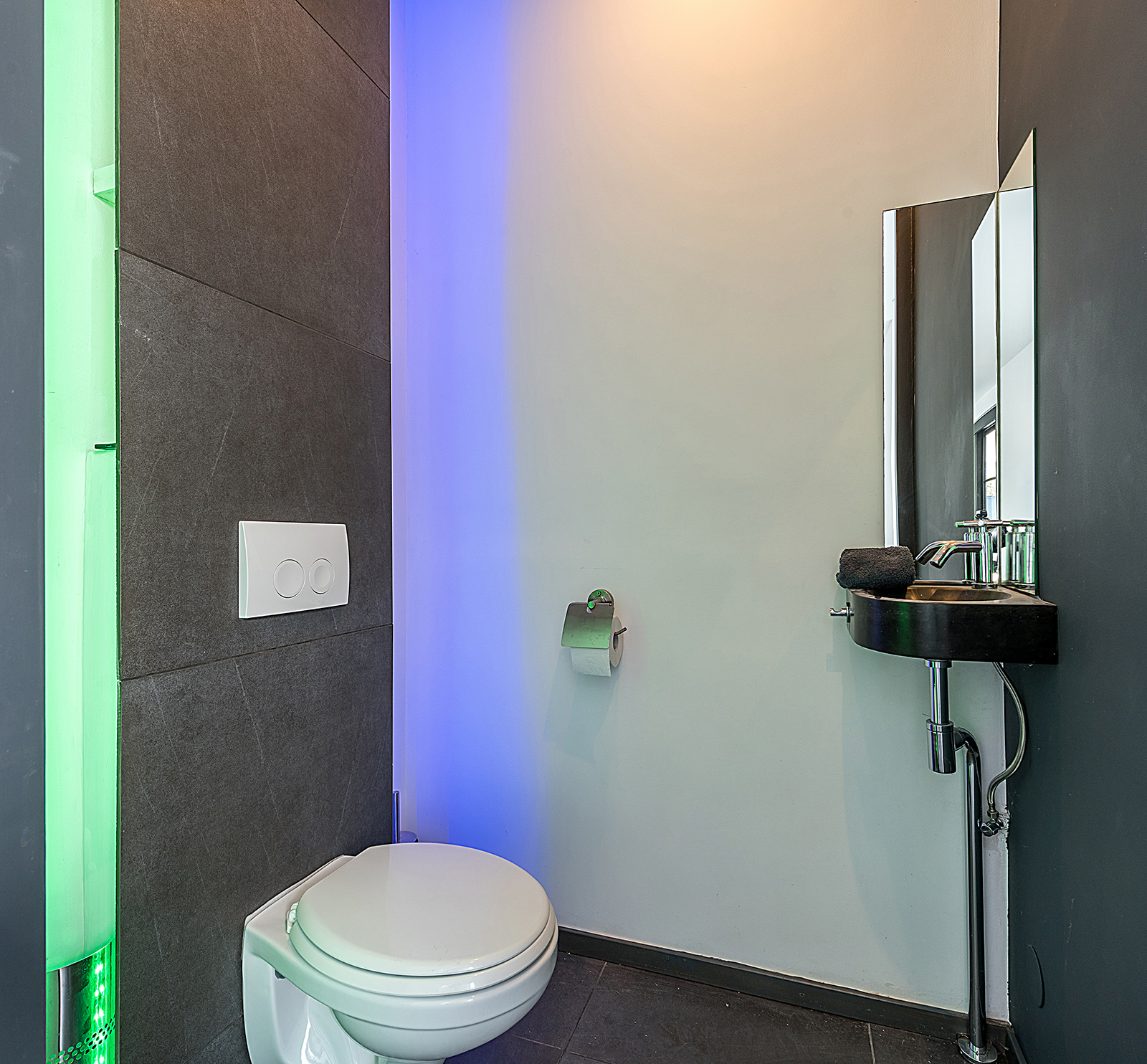 Via de entree/hal met moderne tegelvloer bereikt u het eigentijdse gastentoilet met