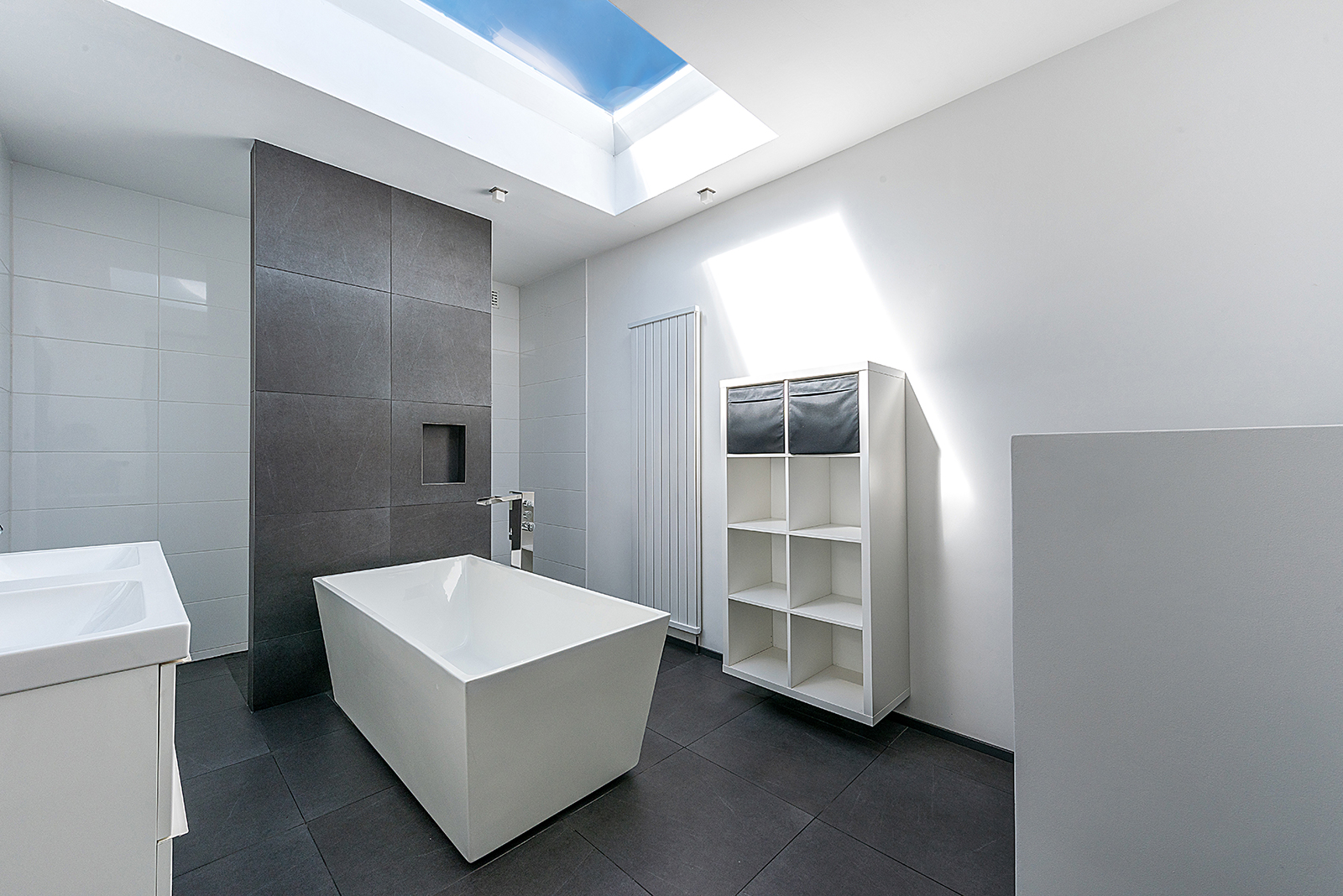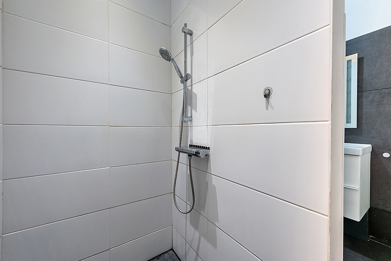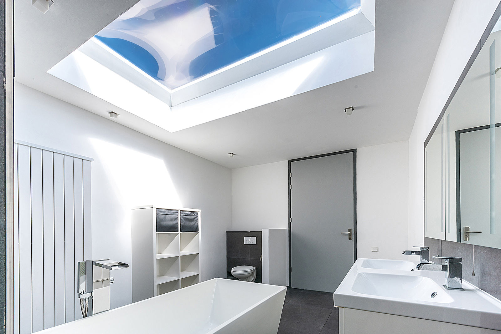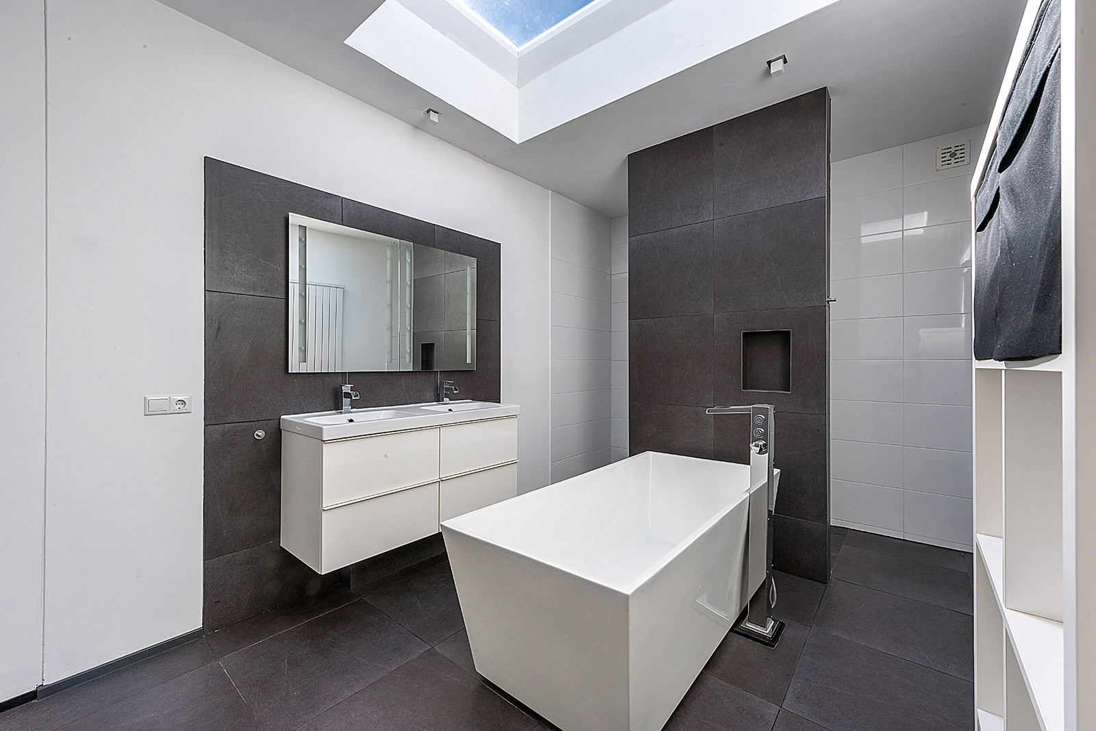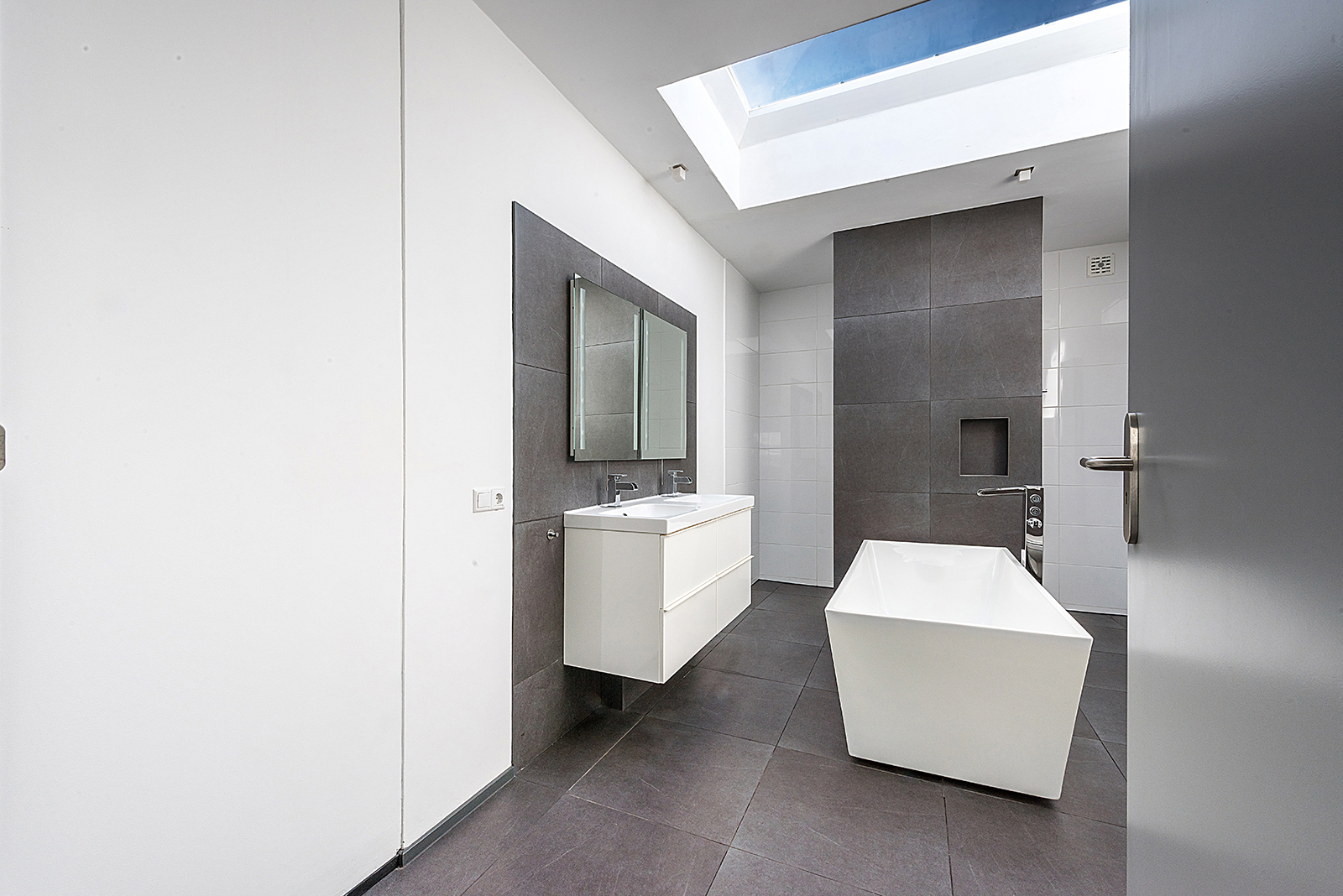uitgerust met een ligbad, inloopdouche, dubbele wastafel en een tweede toilet.