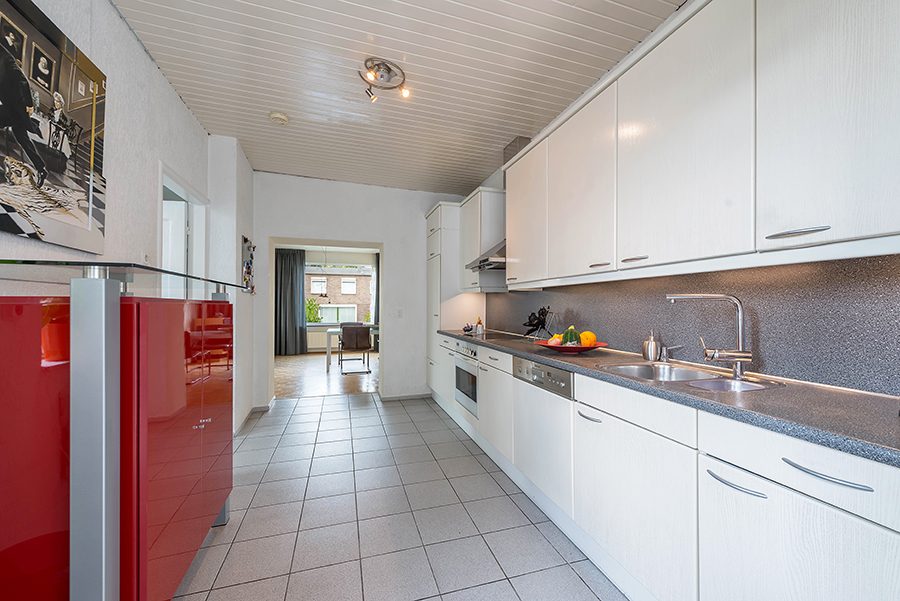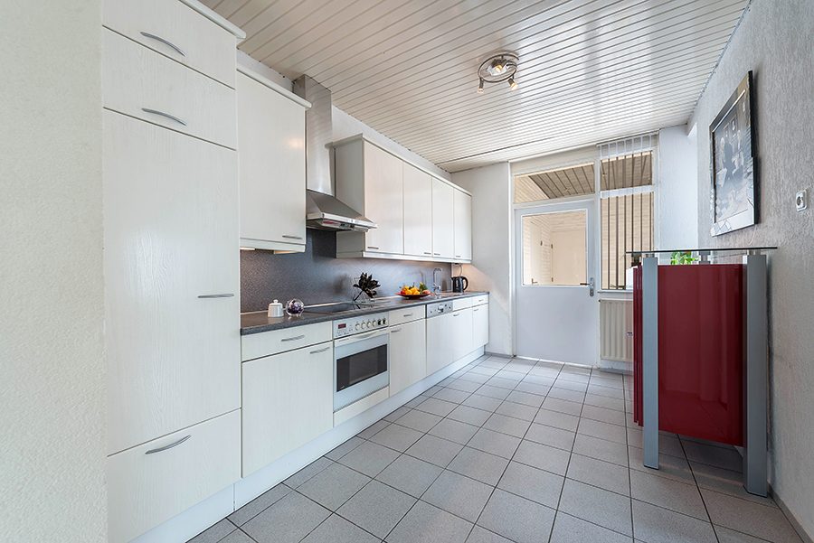 Keuken ca. 4.50 x 2.60 met tegelvloer, aanbouwkeuken v.v. keramische kookplaat, oven, afzuigkap, koelkast en vaatwasser.