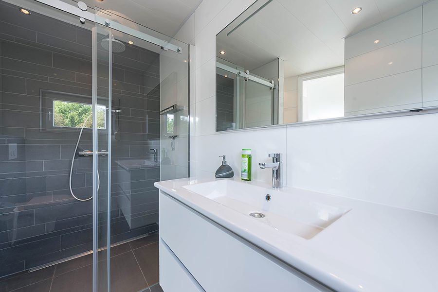 Modern betegelde badkamer met inloopdouche, wastafel en hangtoilet.