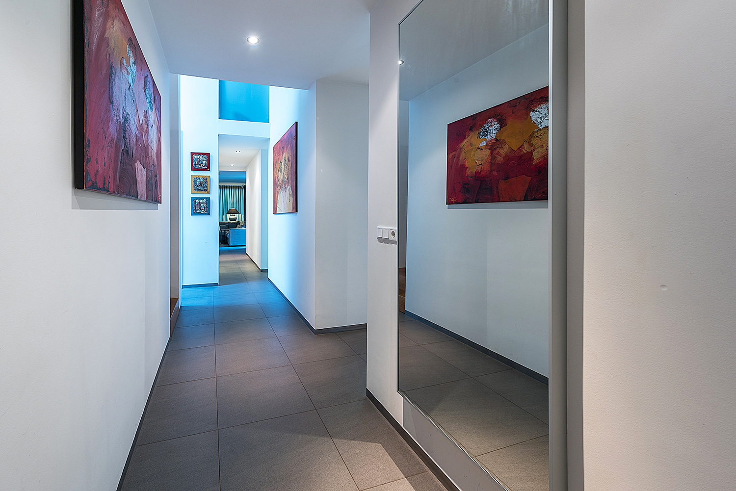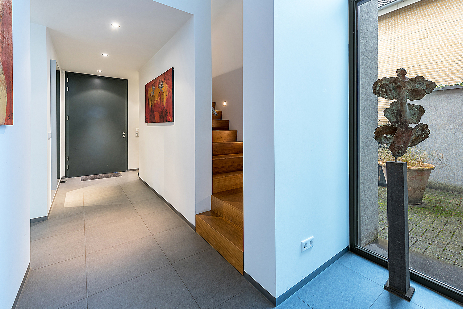 De begane grond is afgewerkt met een doorlopende plavuizenvloer met vloerverwarming.