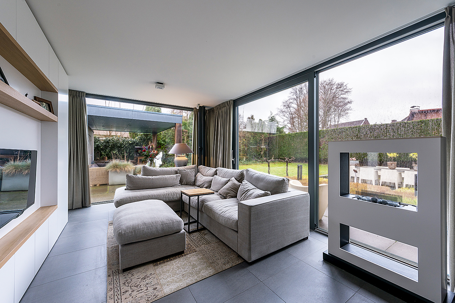 een schuifpui een fraai zicht op de tuin geboden wordt met eveneens een luxe op maat gemaakte