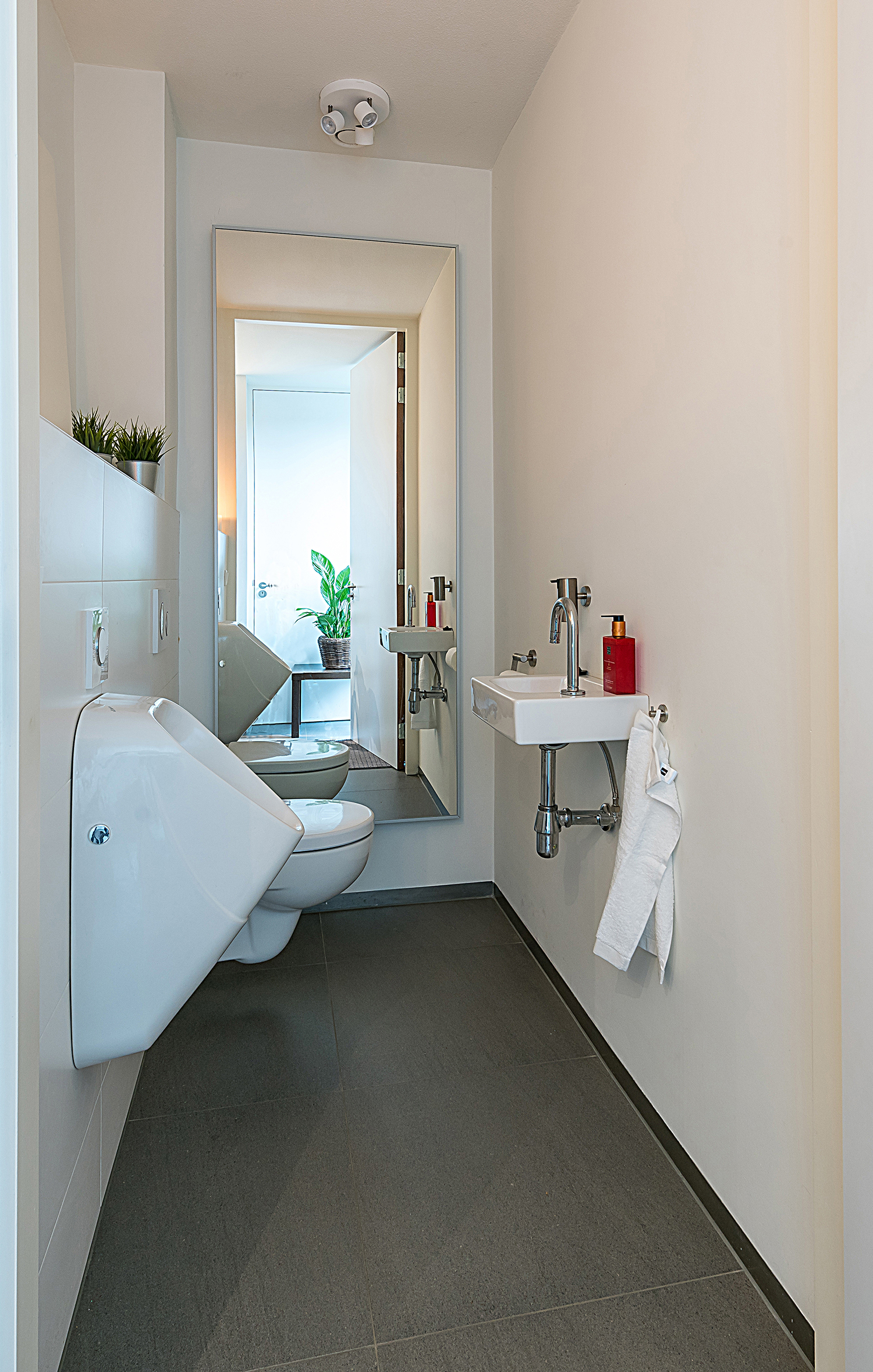 Toiletruimte (met wc, separaat urinoir en fonteintje) t.b.v. het kantoor en een doucheruimte (ca. 2.00 x 1.90)