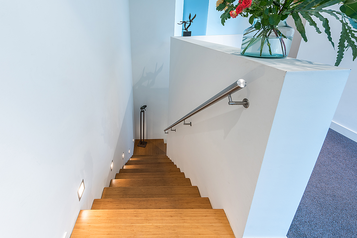 strakke houten trappartij met wandverlichting naar de verdieping.