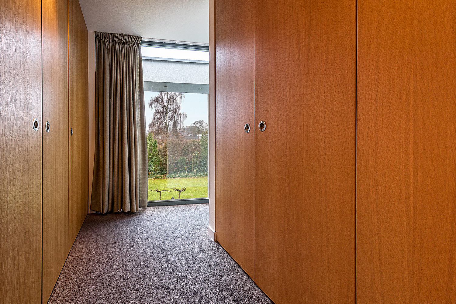 op maat gemaakte kledingkasten en deur naar de badkamer.
