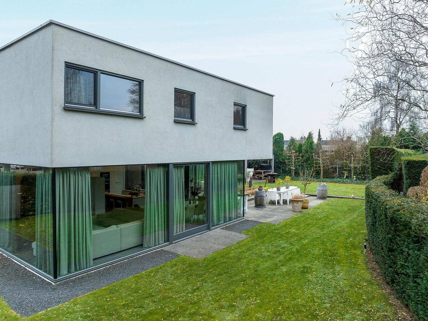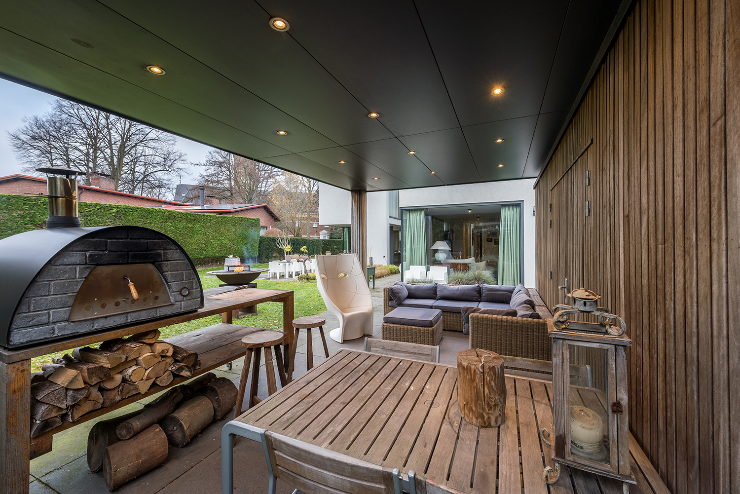 de Botanische tuin en de eigen riante tuin met twee grote schuifpuien naar het overdekt terras en