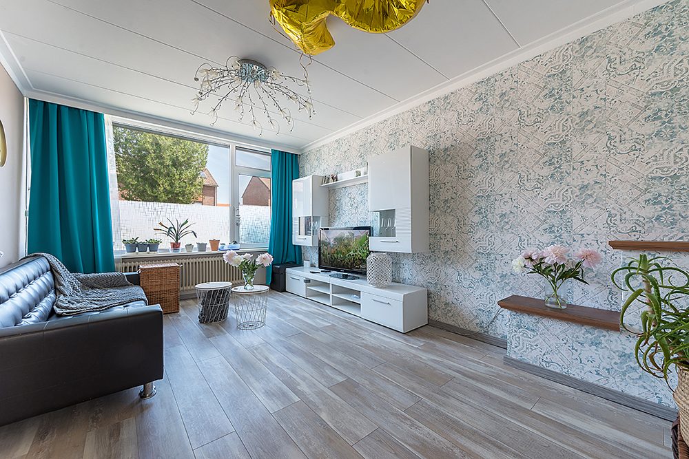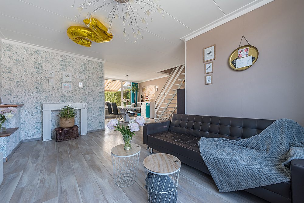 Ruime Z-vormige woonkamer ca. 8.15 x 3.30/3.15/5.65 met laminaatvloer en trap naar de verdieping.