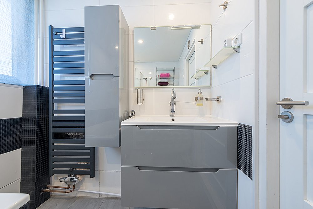 Moderne badkamer met ligbad, wastafelmeubel, designradiator en 2e toilet. Vernieuwd plafond met inbouwverlichting.