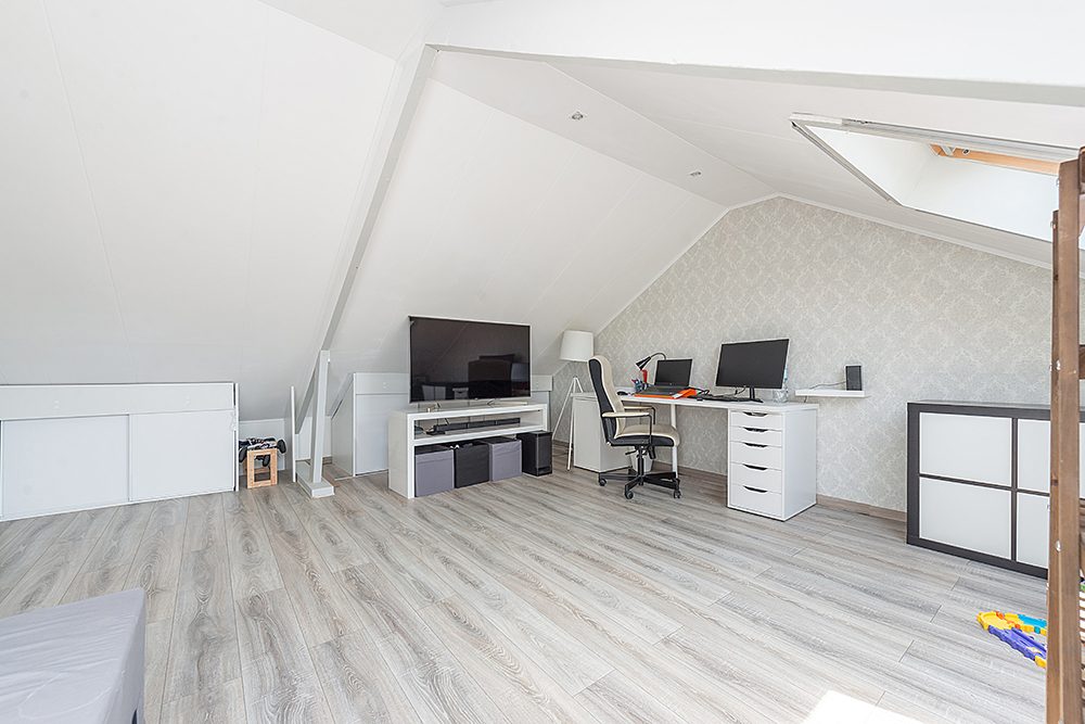 Vaste trap naar een vierde slaapkamer met laminaatvloer en twee dakramen.