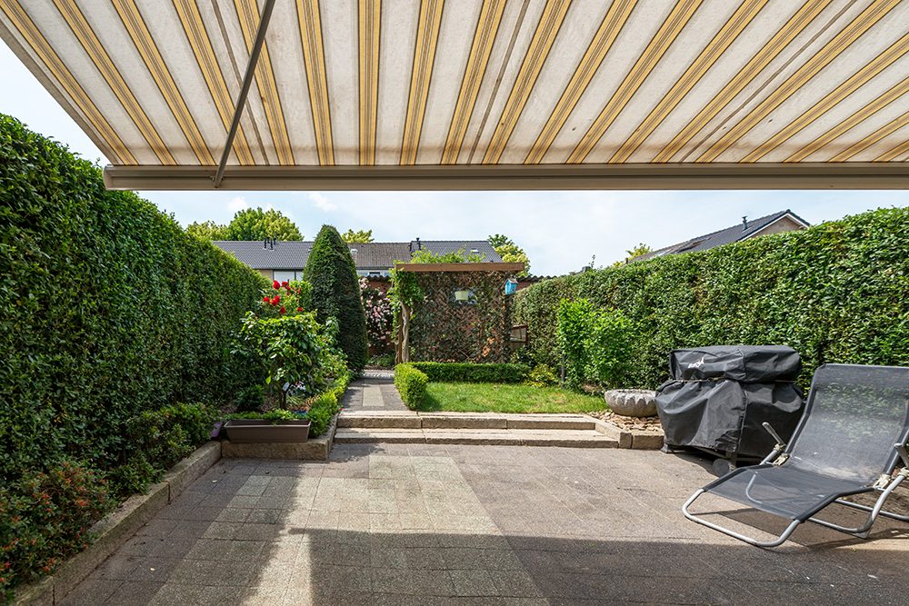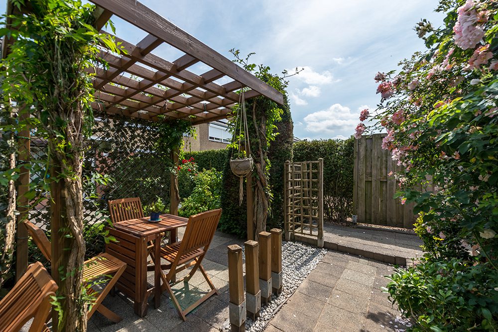 Omsloten siertuin op Zuid-Westen gelegen met buitenberging en uitgang naar een voetpad aan de achterzijde.