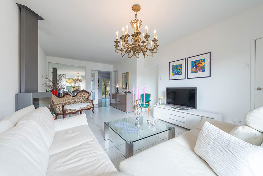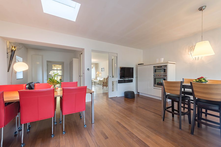 Grote aanbouw ca. 7.50×6.20/3.00 met parketvloer alwaar de leefkeuken is gesitueerd met eetgedeelte en toegang tot een terras,