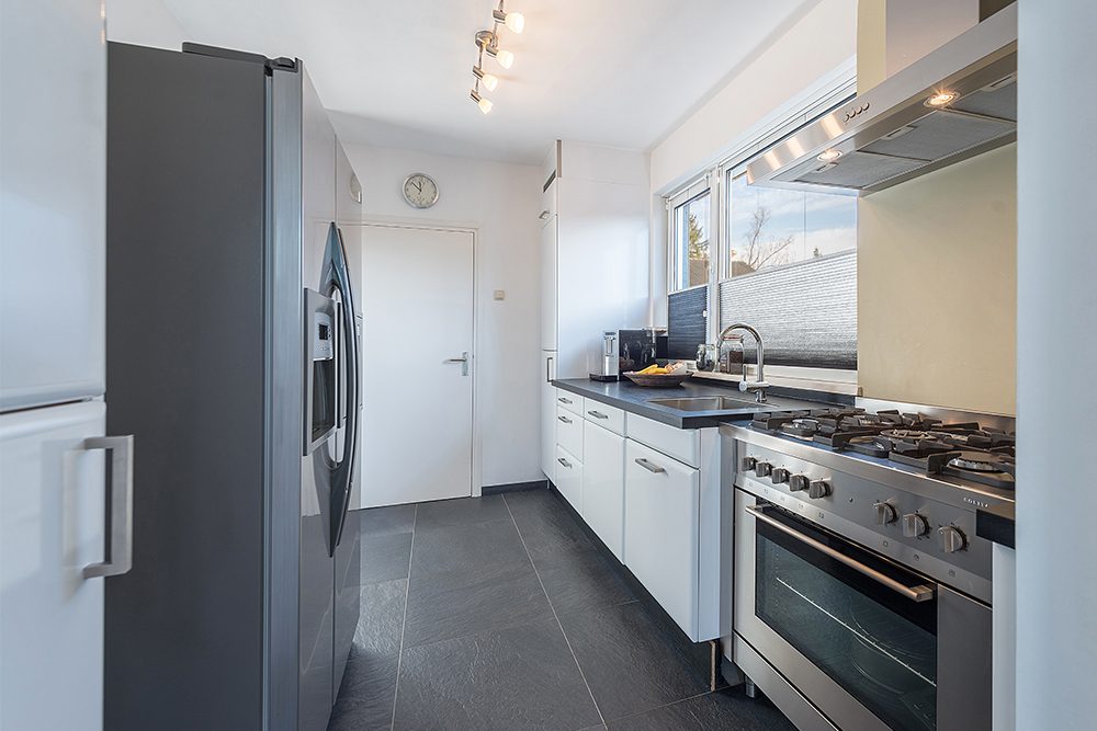 Gesloten keuken ca. 3.50 x 2.50 met tegevloer, moderne aanbouwkeuken v.v. gascomfort, afzuigkap, oven en vaatwasser.