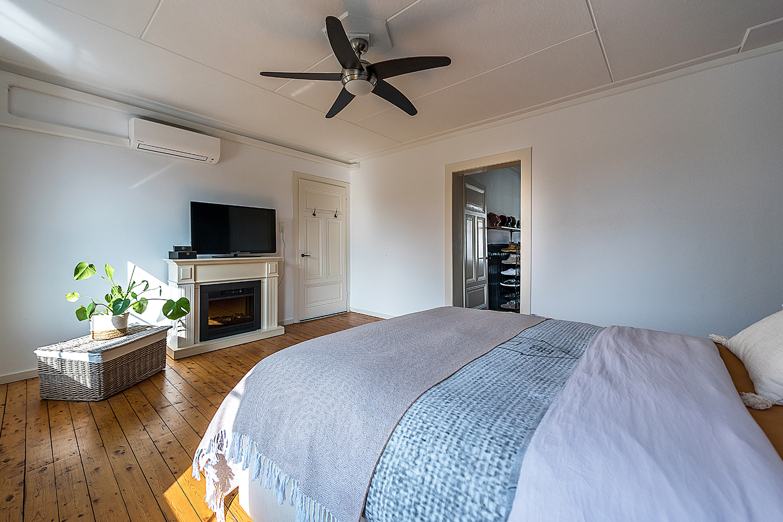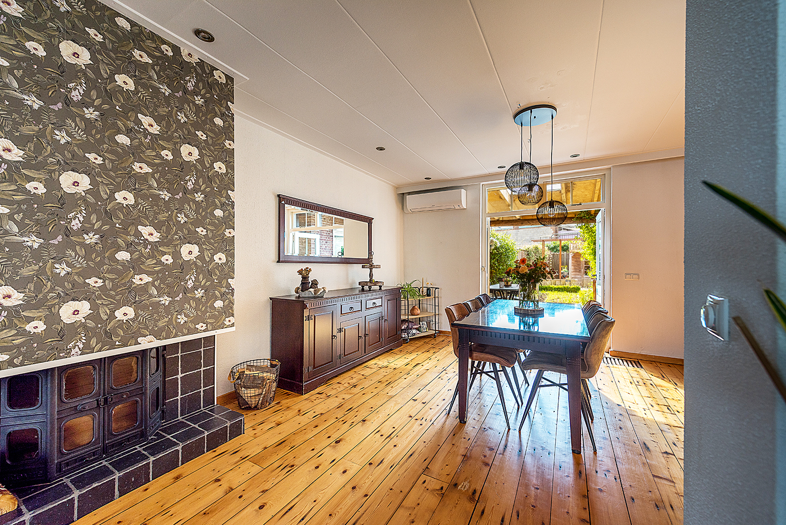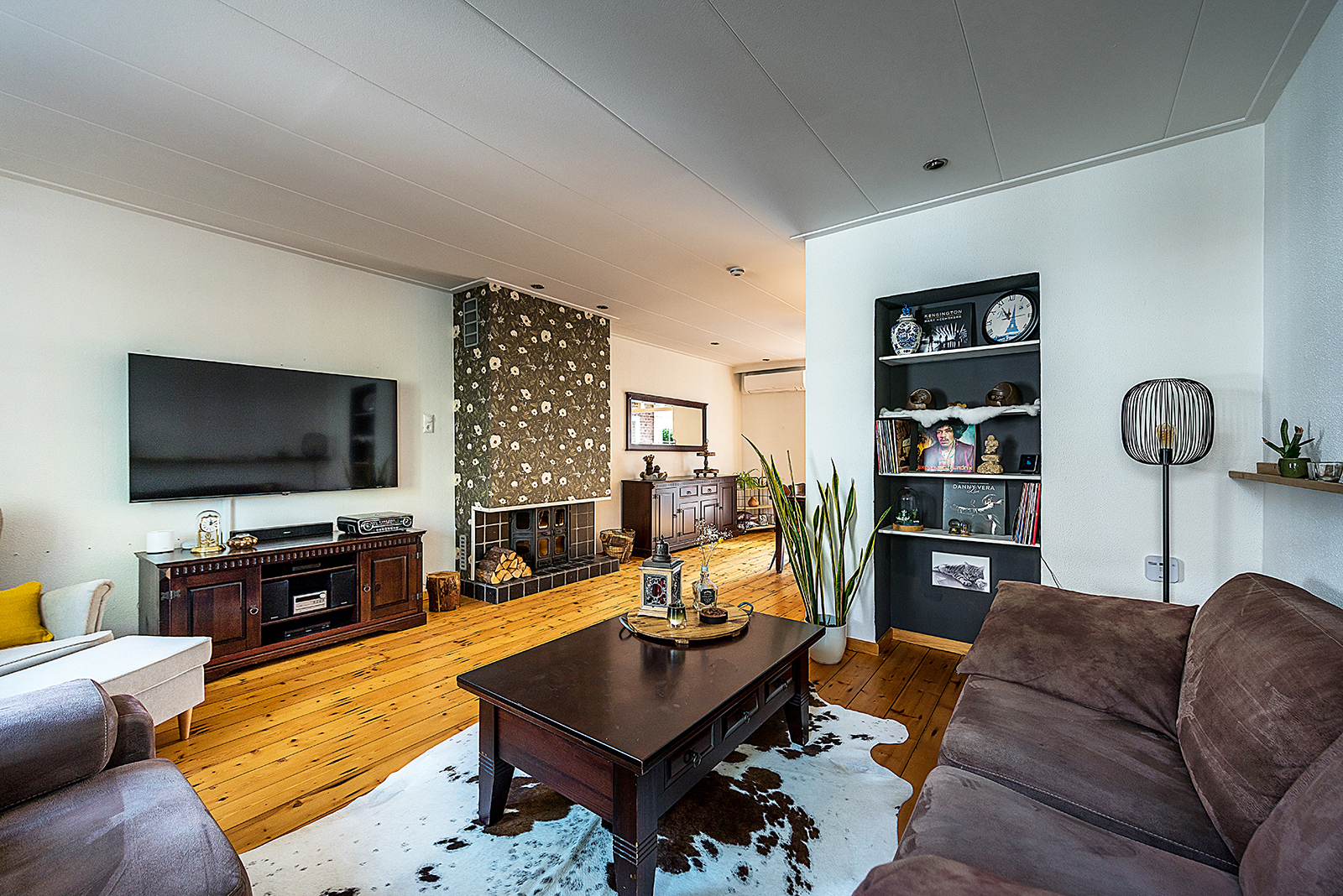 De royale woonkamer is voorzien van houten vloerplanken en airconditioning, wat zorgt voor een aangenaam woonklimaat.