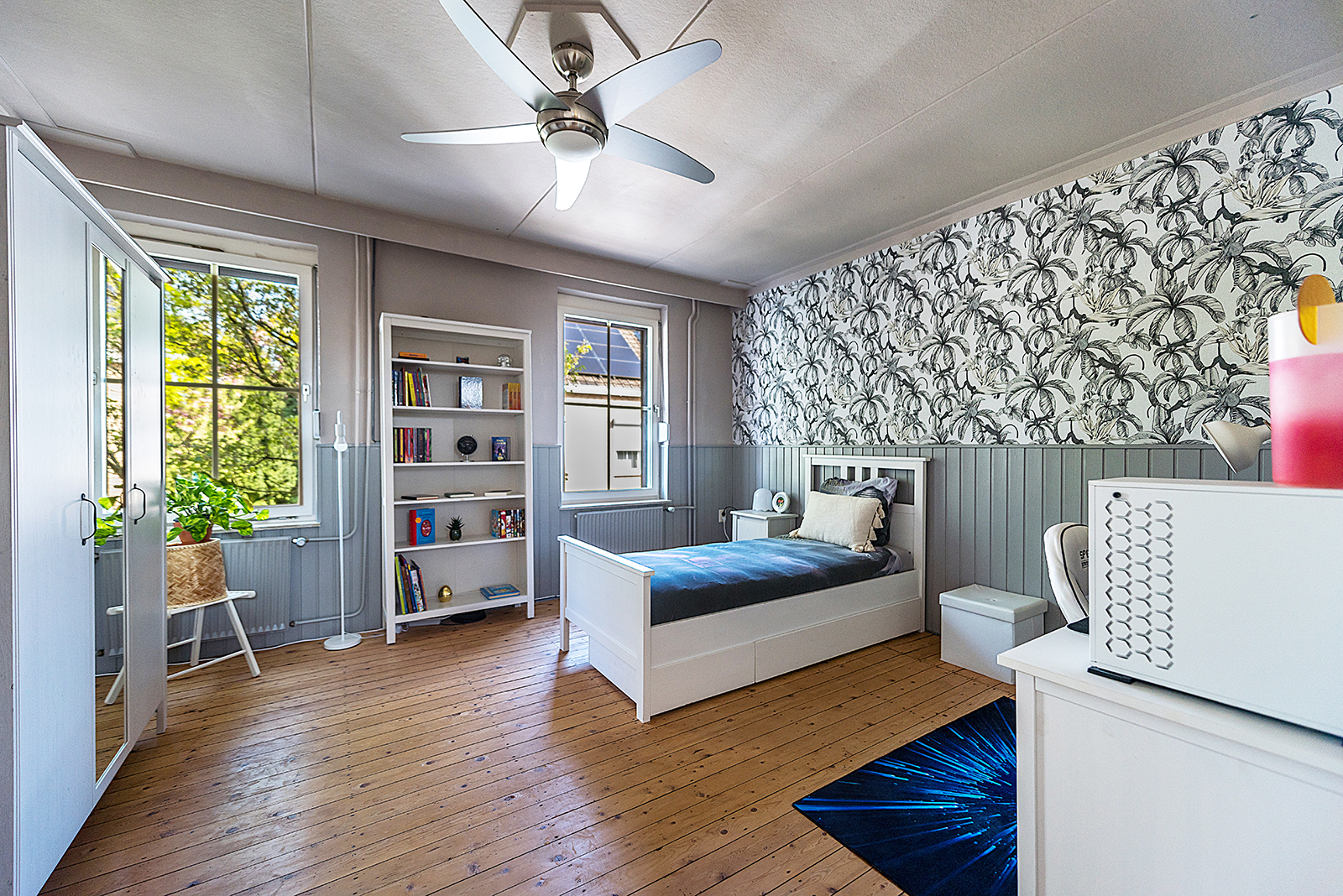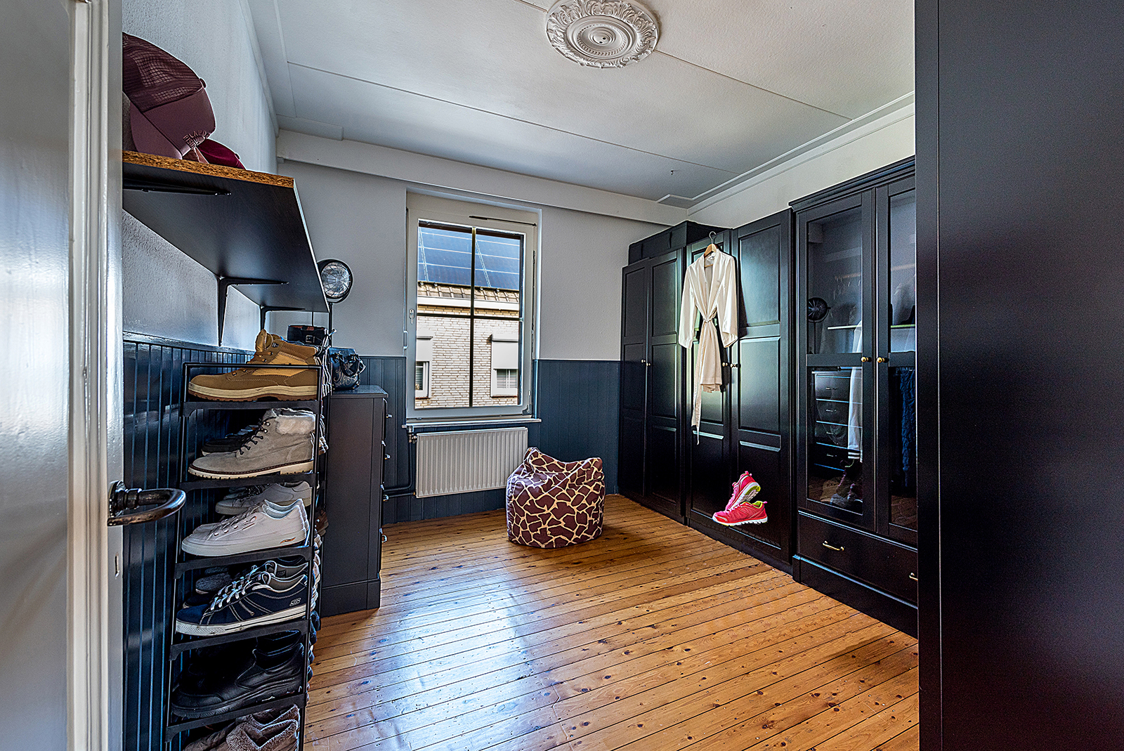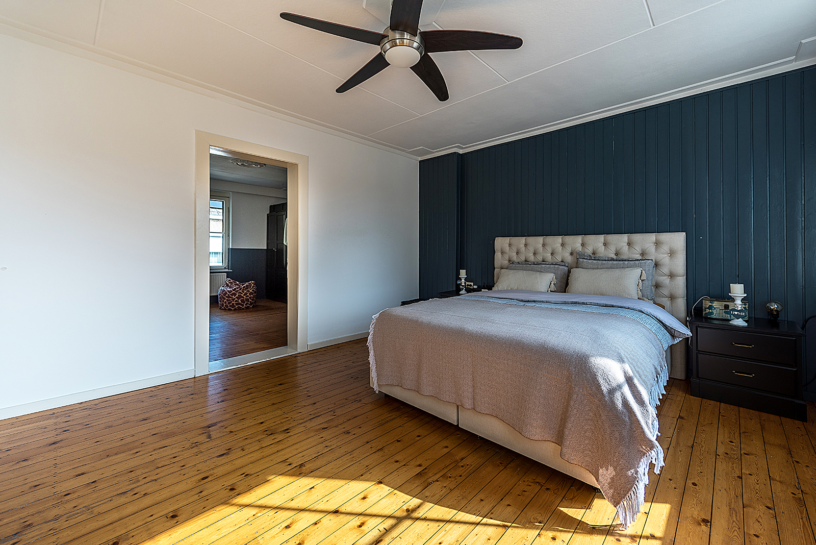 De overloop geeft toegang tot drie slaapkamers. De ouderslaapkamer staat in verbinding met de derde kamer, die momenteel in gebruik is als walk-in closet.