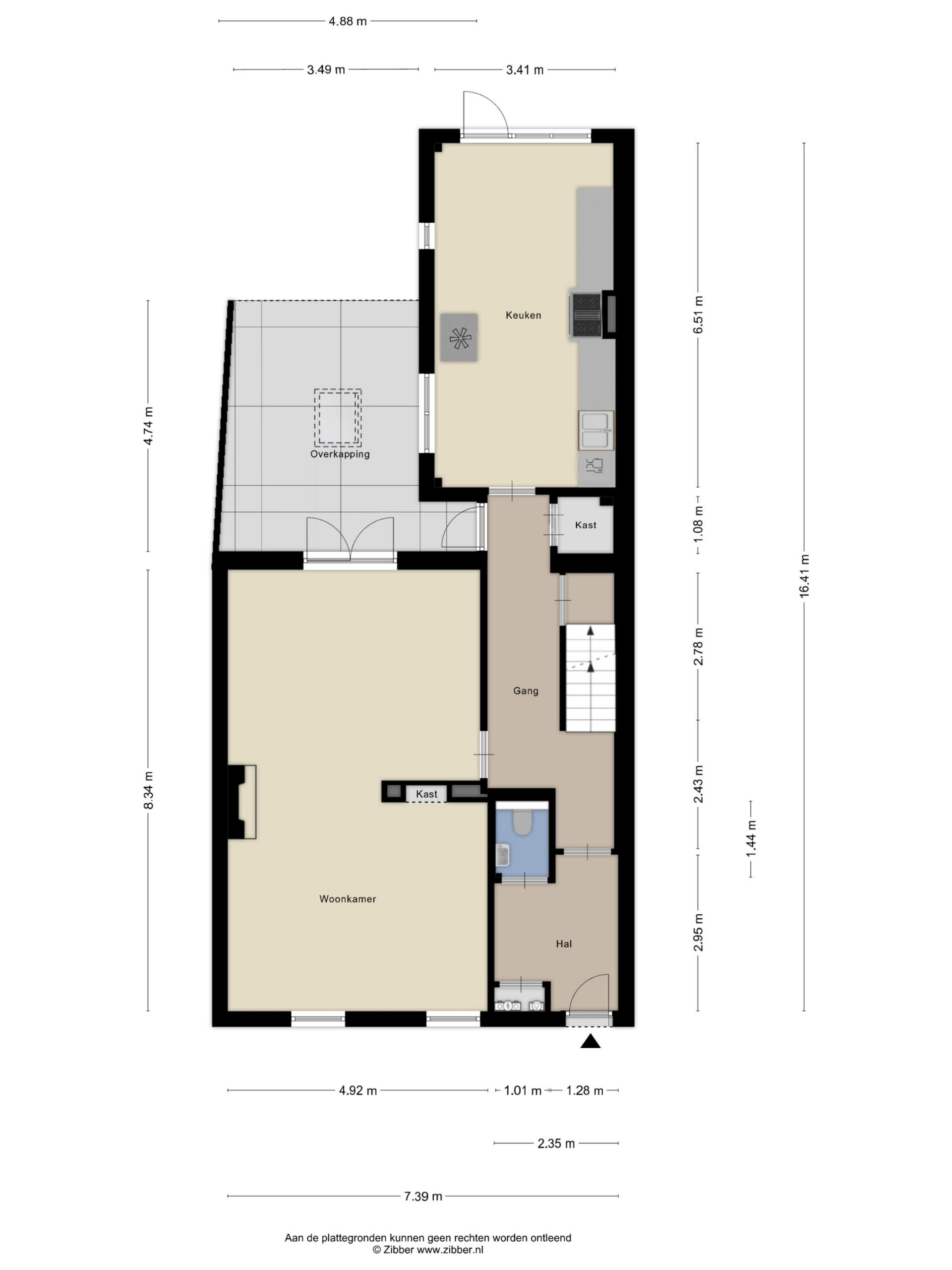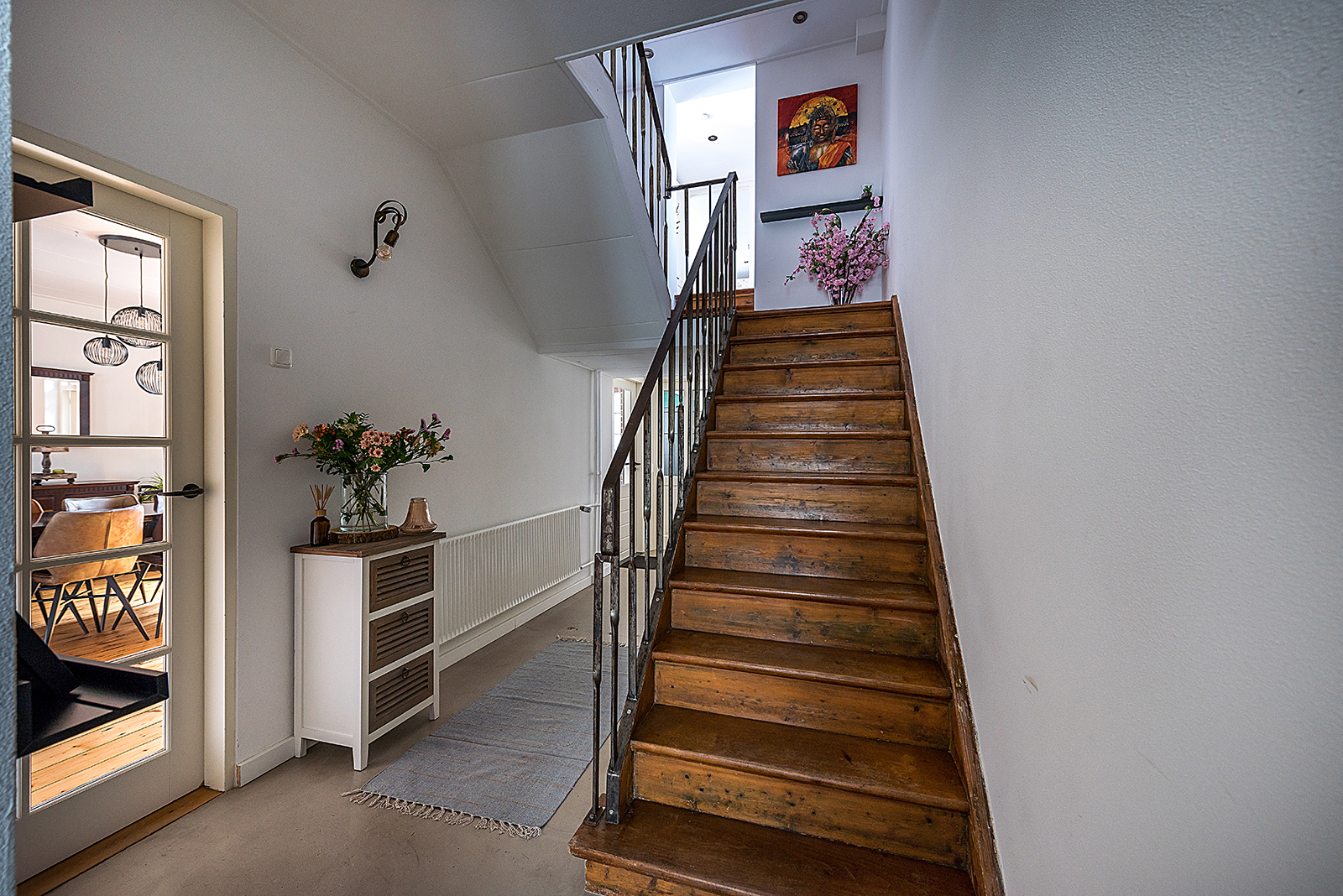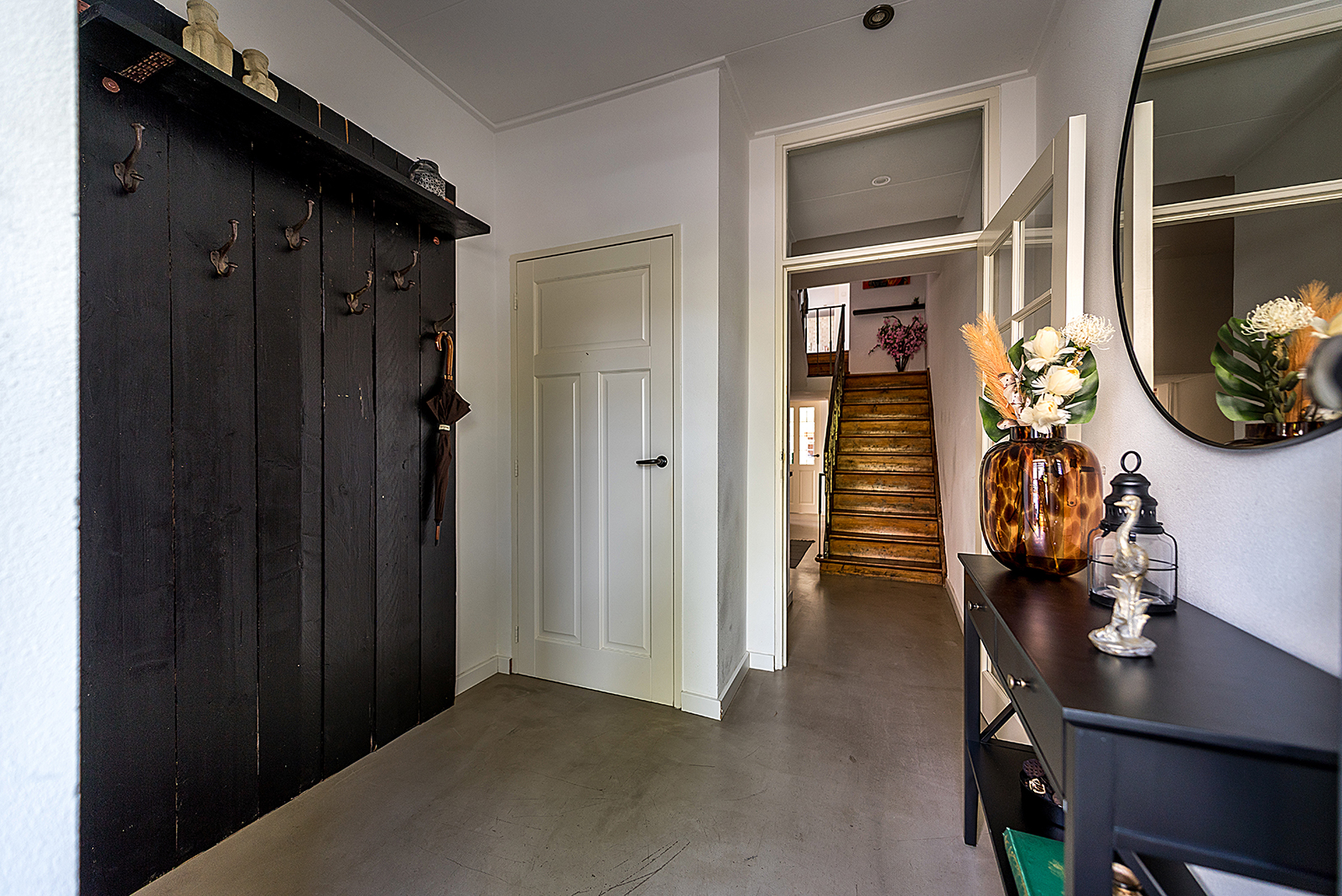 Via de vestibule met vernieuwde meterkast en modern gastentoilet (hangtoilet en fonteintje) betreedt u de woning. De ruime hal met stijlvolle gietvloer en bordestrap geeft toegang tot de leefruimtes.