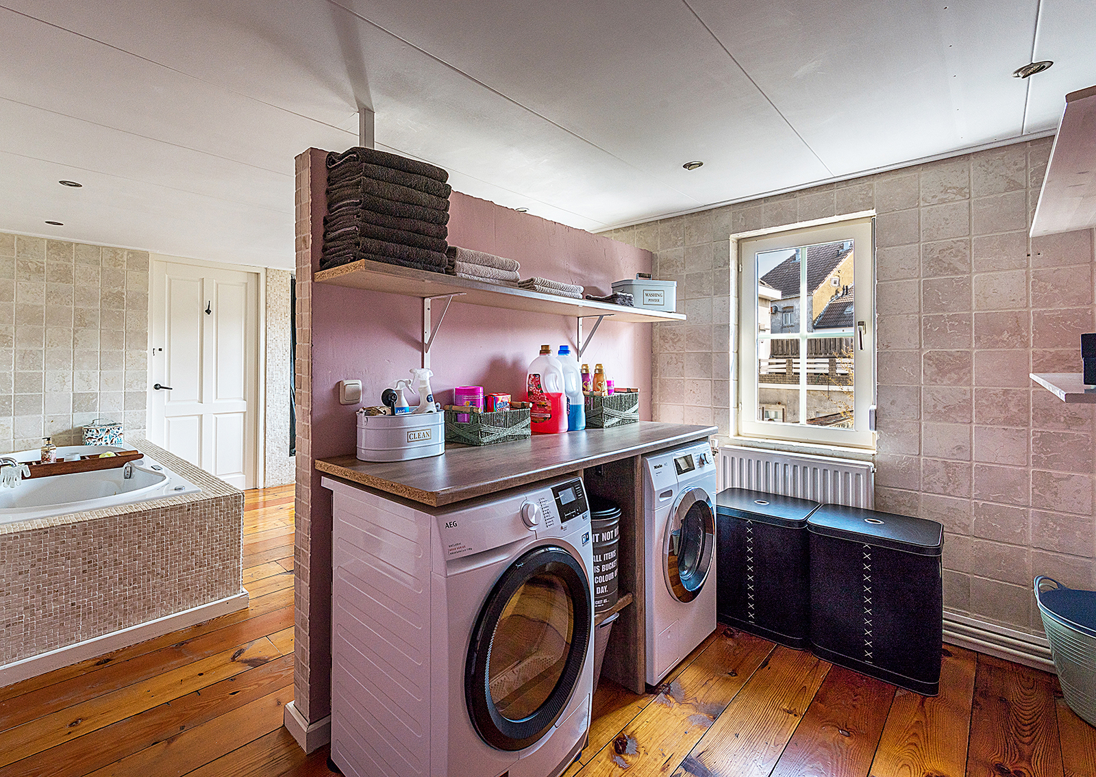 De ruime badkamer is voorzien van een ligbad met whirlpoolfunctie, douche en dubbele wastafel. Daarnaast is er een separaat tweede toilet op de overloop.