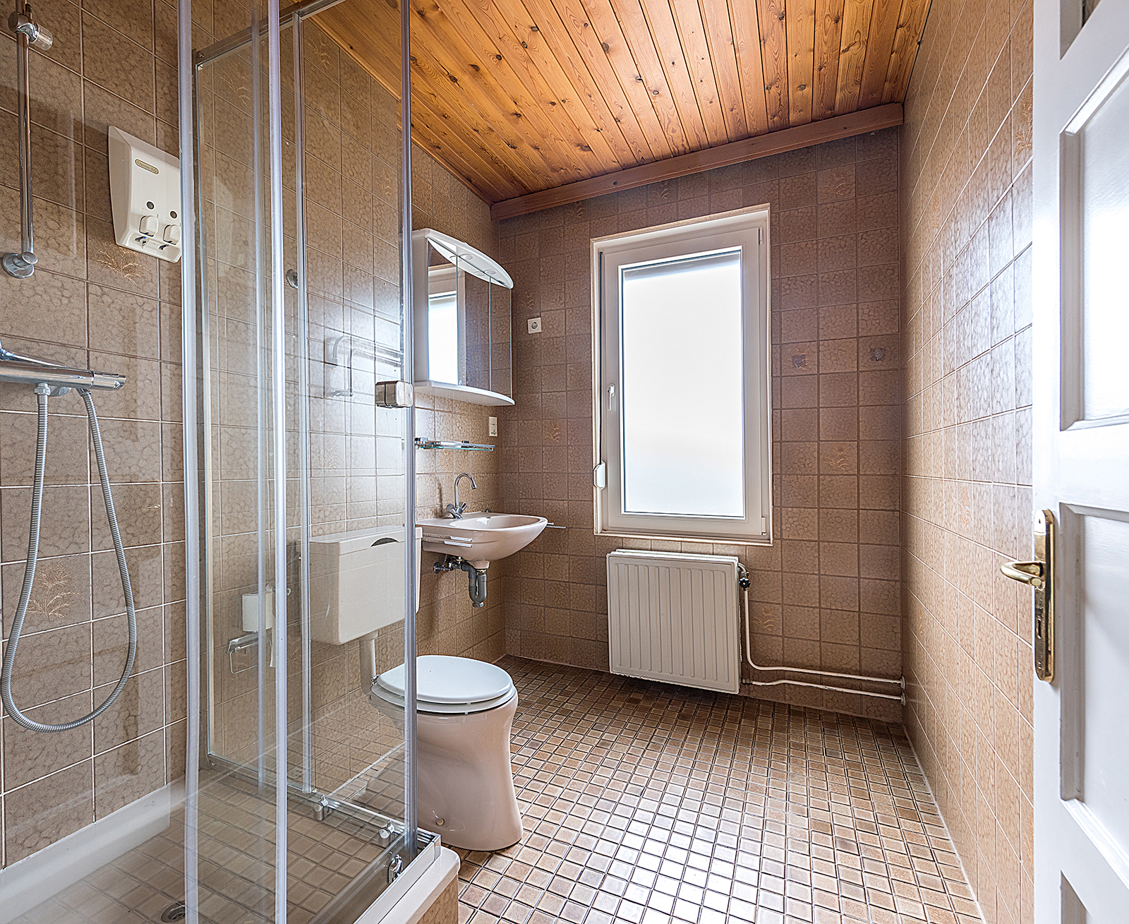 Overloop met toegang tot drie slaapkamers resp. ca. 3.84 x 3.50, 3.80 x 3.60 en 2.55 x 1.96 De badkamer ca. 2.60 x 1.95 is uitgerust met een douche, wastafel en tweede toilet.