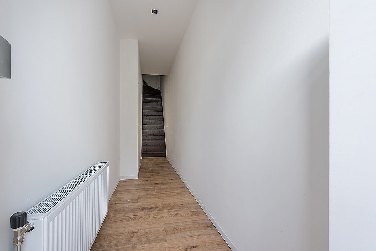 Entree, ruime hal met vernieuwde meterkast, laminaatvloer en trap naar de verdieping.